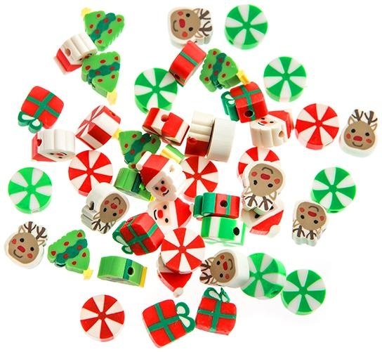 Koraliki polimerowe do biżuterii bransoletek motywy świąteczne choinki, reniferki,prezenty, cukierki, 1 cm, 48 szt