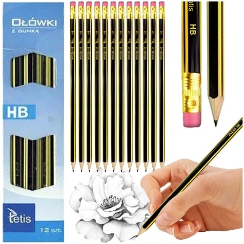 OŁÓWEK HB SZKOLNY DREWNIANY Z GUMKĄ OŁÓWKI TETIS 12 szt.